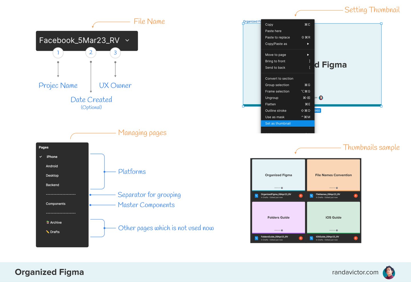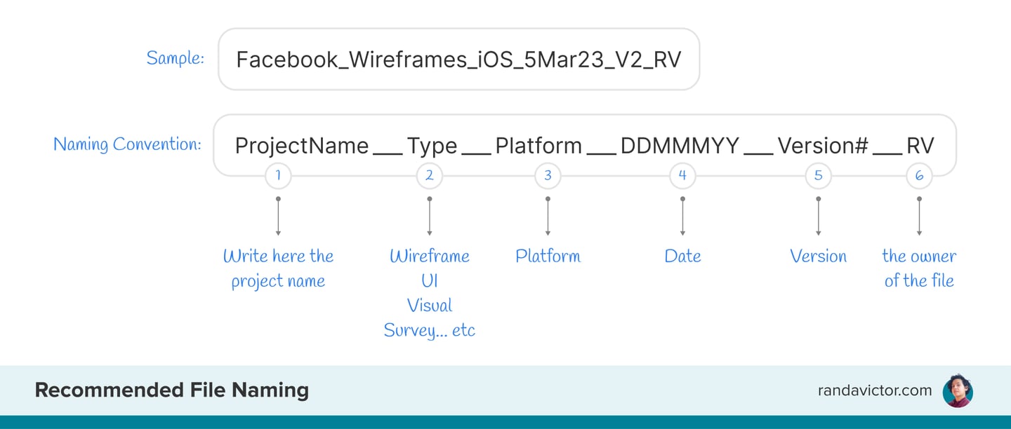 Use the same file naming convention as the file name (without platform or types). This will help identify when the project began and who the owner is. You can add a date, but it's an extra step since Figma already has a history log.